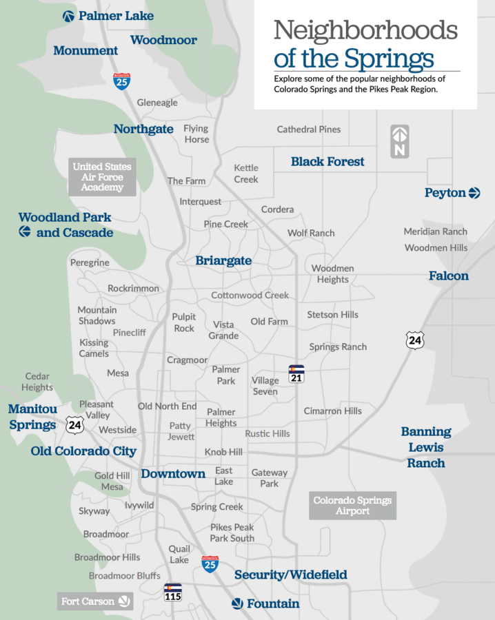 This Neighborhoods map is provided courtesy of the Springs Relocation Guide: https://springsrelocationguide.com/